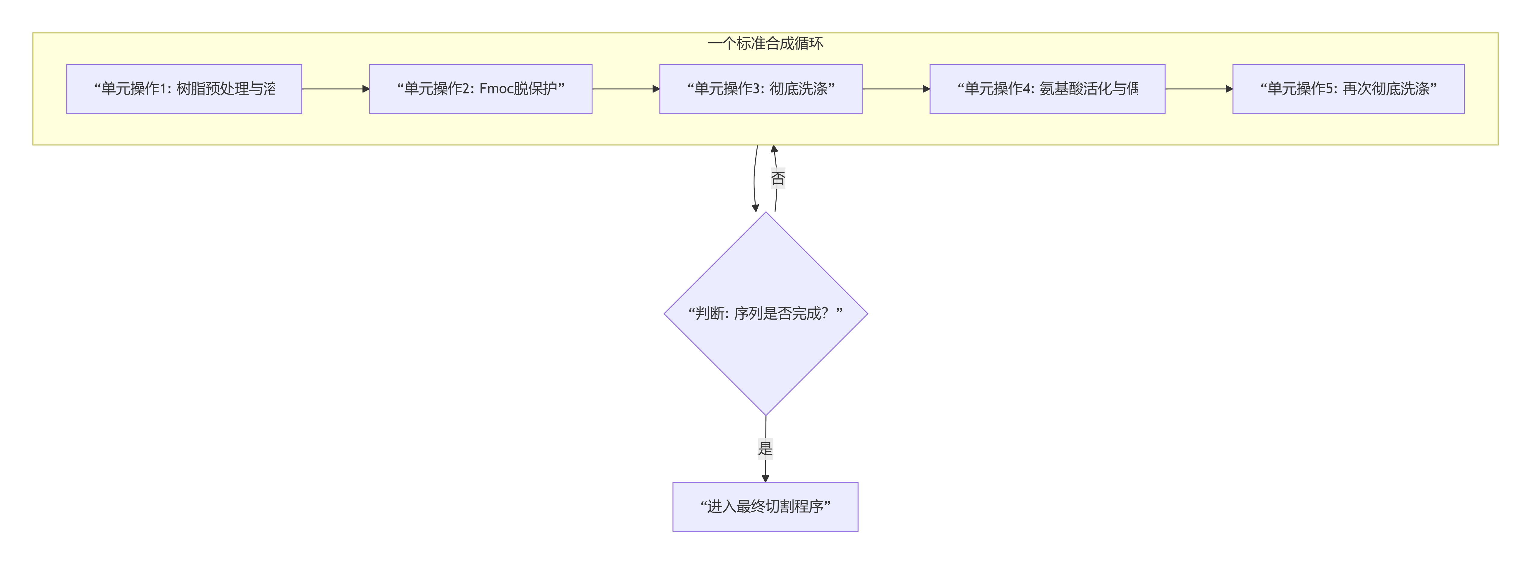 标准Fmoc-SPPS循环的目标,是将一个保护氨基酸单体高效、高保真地连接到生长中的肽链上。其流程本质是一个反复进行的“官能团去屏蔽-偶联-清洁”过程,可抽象为以下高度工程化的序列: